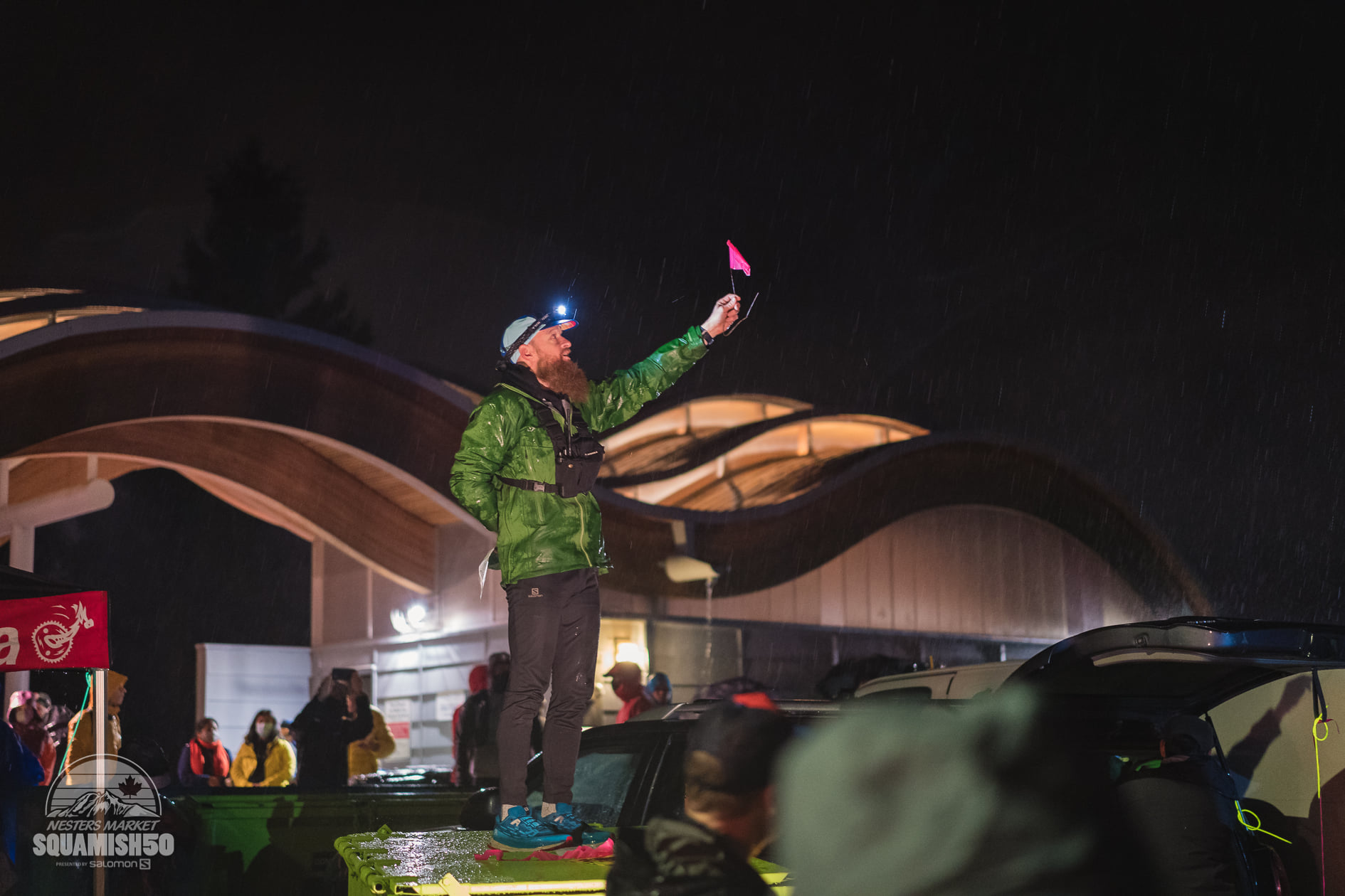 Lining up in the dark at 5am, we are, all of us, question marks, waiting for a sleep-depraved orange-bearded man to execute a countdown; 10… Five races in 3 days for this man. 9… The deep shadows under his eyes. 8… The croak in his voice. 7… You can tell, this start line, for him, is also a little pink flag. 6… And every finish line hug, he gives, is a little pink flag. 5… Just as he’s a little pink flag for us. 4… And when he says: 3… You can almost hear it. 2… We’re all thinking it. 1… Why?